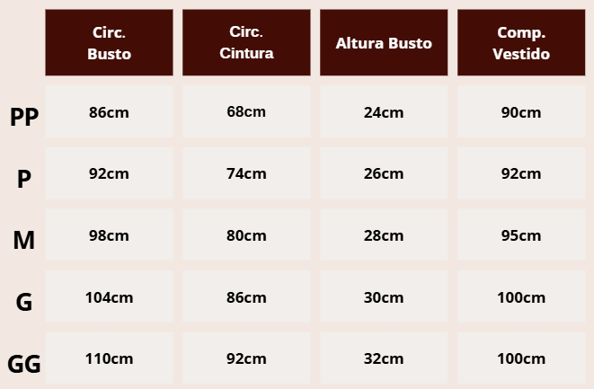 Obs.: as medidas informadas na tabela abaixo referem-se às medidas exatas do corpo, sem a inclusão da margem de vestibilidade.